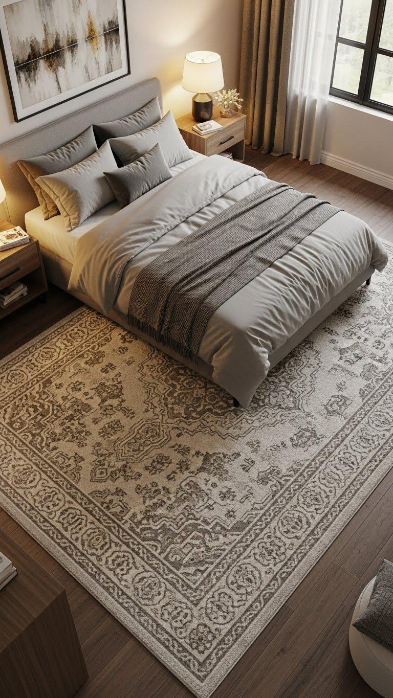 You’ll prioritize rug placement—leave equal borders on both sides, extend beyond the foot—and choose pattern scale that suits bed size; bold, oversized motifs free the space while subtle repeats create calm, intentional cohesion.