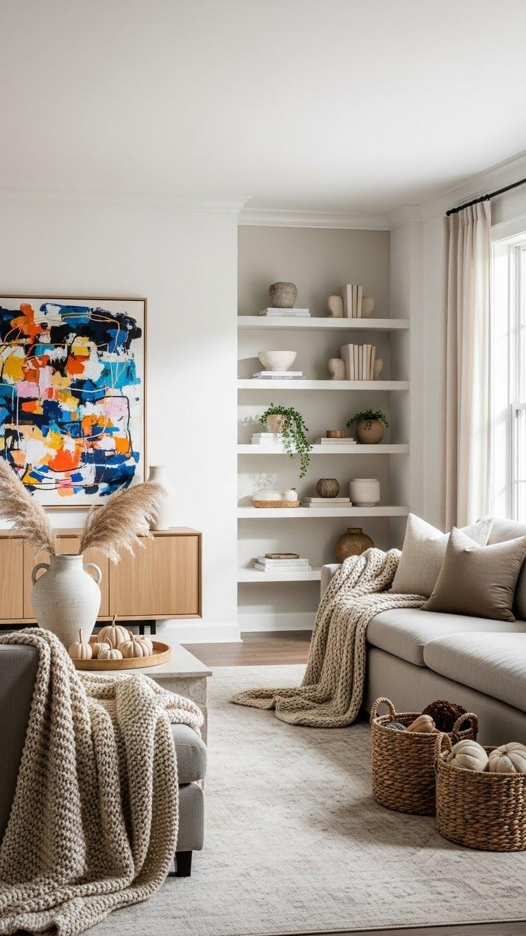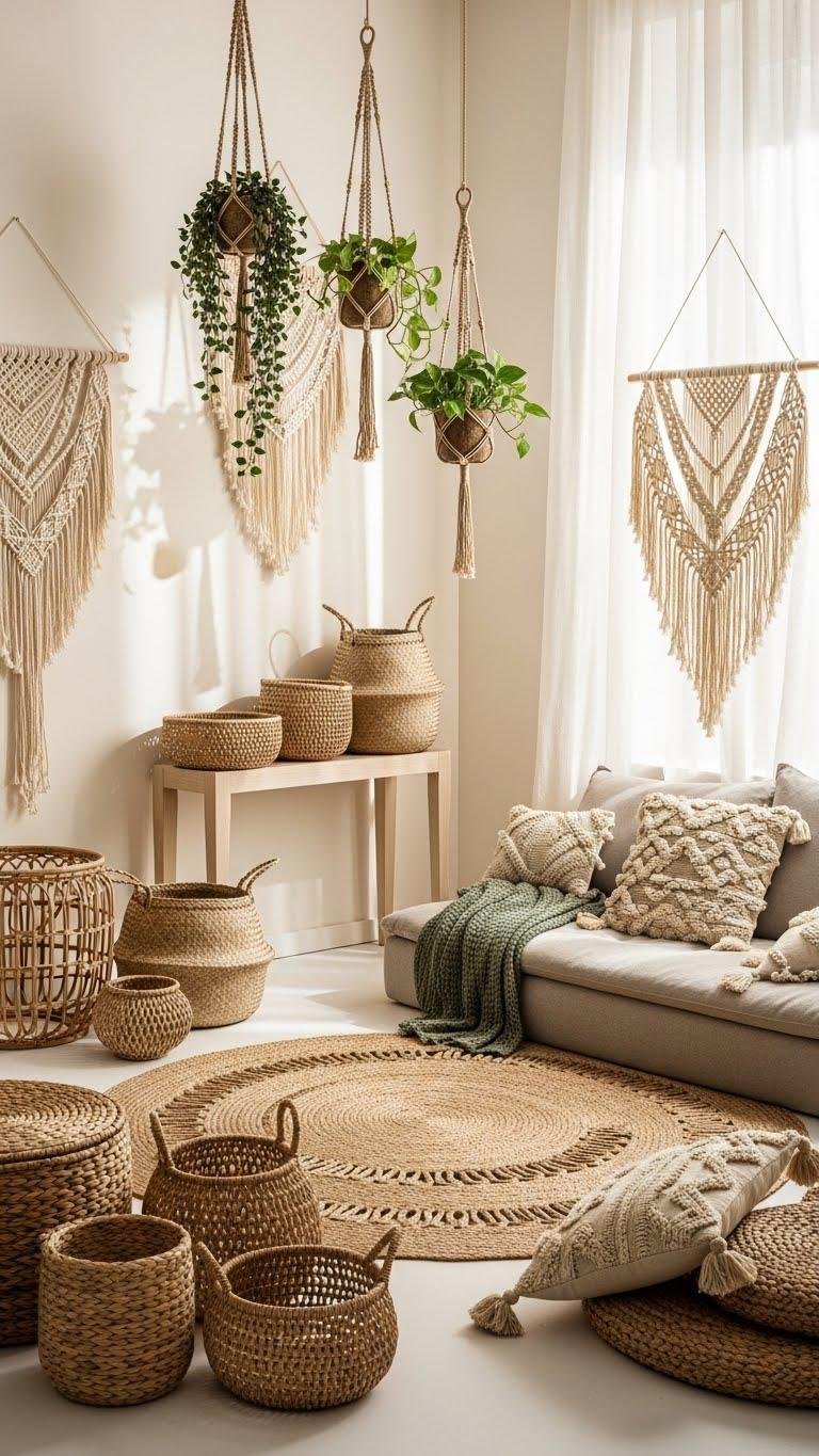 Neutral backdrops make it easy to layer in natural textures, so bring woven baskets and fiber accents into view to add warmth and tactile interest. You’ll mix woven wall hangings with sculptural baskets and fiber plant holders to create pockets of calm, letting light and shadow play across surfaces.