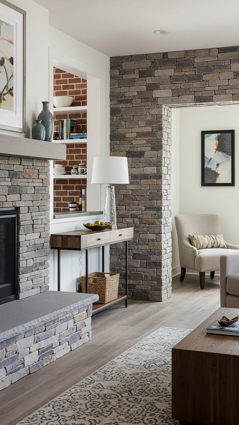 Although stone and brick feel rooted in history, you can use them as a contemporary layer that grounds a cozy room; think a low-profile hearth wall, a slim brick ledge behind a console, or a fieldstone panel framing a reading nook.