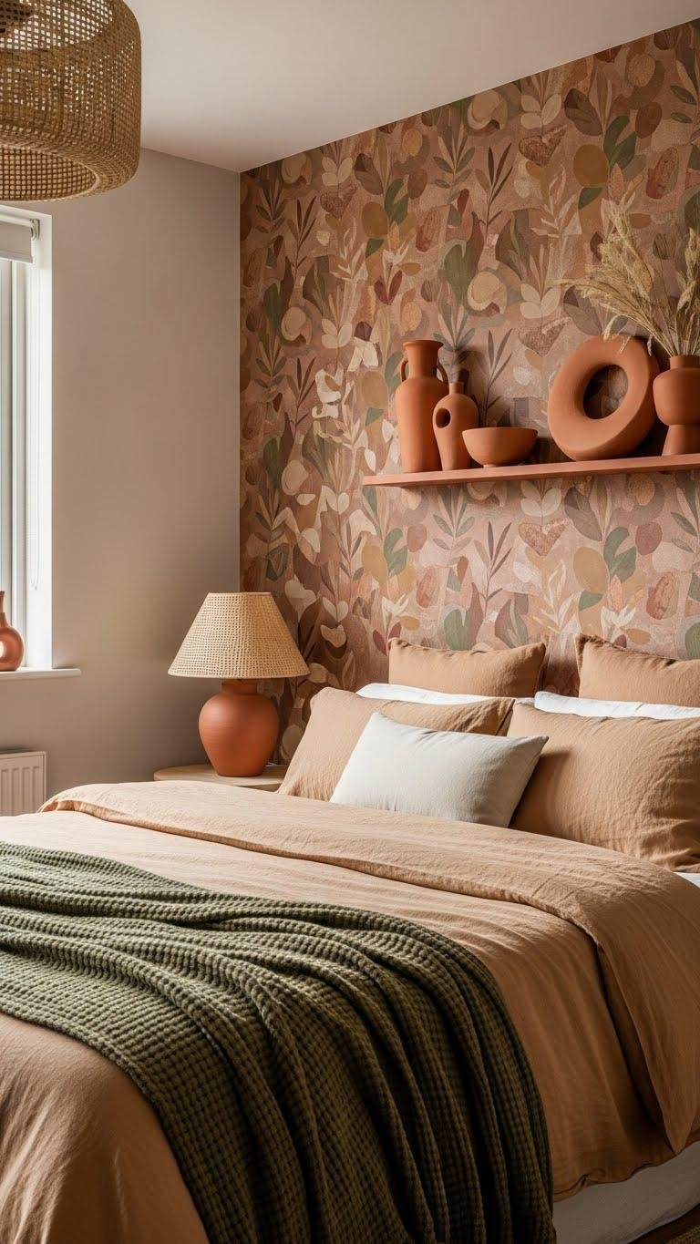 Layer earthy wallpaper on an accent wall, add terracotta accents through pottery and lamps, and choose linen bedding in sandy tones.