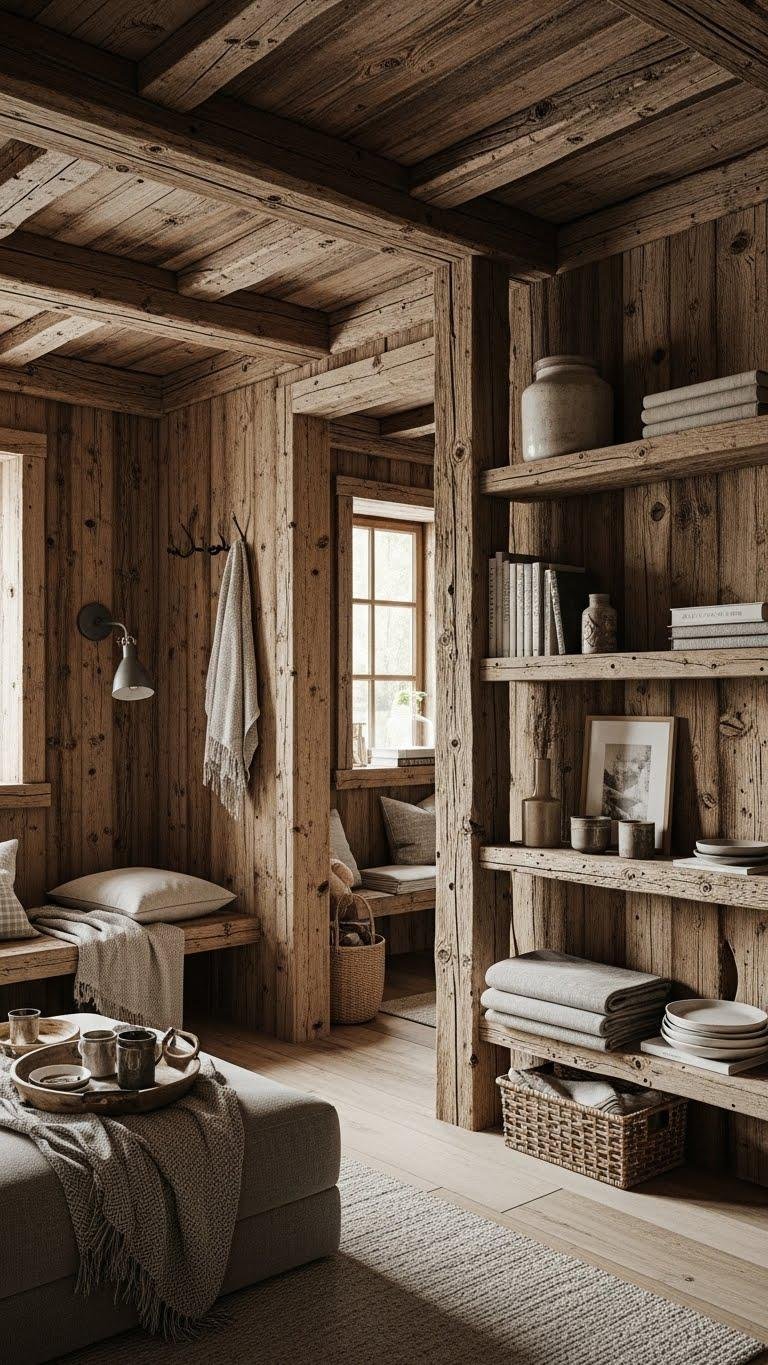 Bring in rustic, unfinished wood to anchor rooms with honest texture and quiet character. You’ll layer weathered beams overhead, reclaimed panels on walls or furniture, and raw shelving to craft a liberated, lived-in vibe.