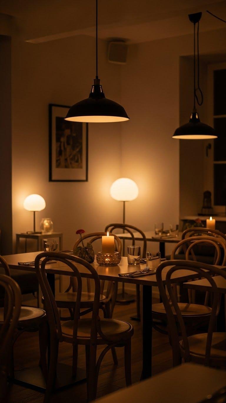 Keep surfaces uncluttered, textures tactile, and light levels low—so meals feel unhurried, personal, and free from rigid formality.