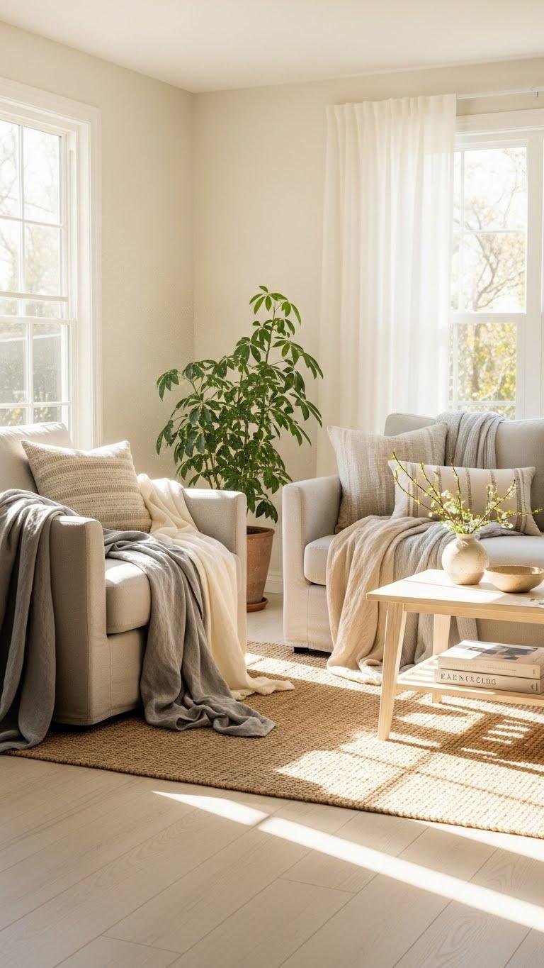 You’ll want to keep the warmth you love without the winter weight, so swap heavy knits for linen and cotton throws, add low‑pile rugs, and bring in soft sage, apricot, and watery‑blue accents. Think layered pillows, rattan surfaces, and small herb pots for scent and texture—simple swaps that make rooms feel airy yet intentional. Here are 22 cozy, easy changes to shift your space without a full overhaul.