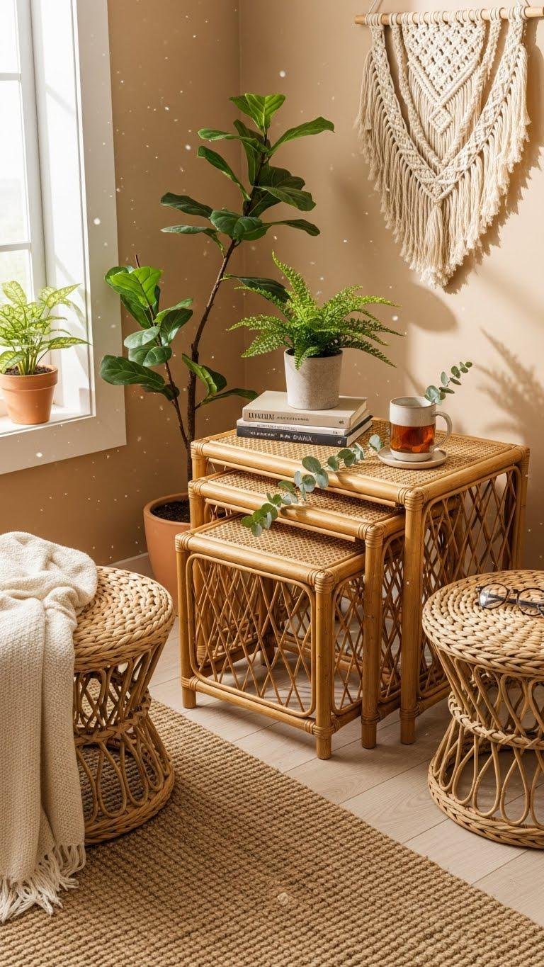A few light rattan or wicker side tables can instantly warm a room while keeping the look airy and uncluttered. Choose rattan nesting pieces to save space and create flexible surfaces for books, plants, or coffee.