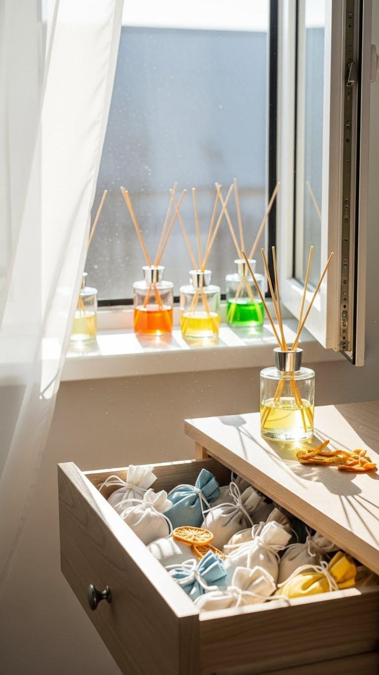 That light, airy corner looks even fresher when you swap heavy, smoky candles for brighter scents like citrus or linen. Choose citrus diffusers to lift mood and air, placing one near windows or seating. Tuck linen sachets into drawers and closets to extend freshness. You’ll feel lighter, freer, and more intentional about scent without cluttering surfaces or reverting to winter heaviness.