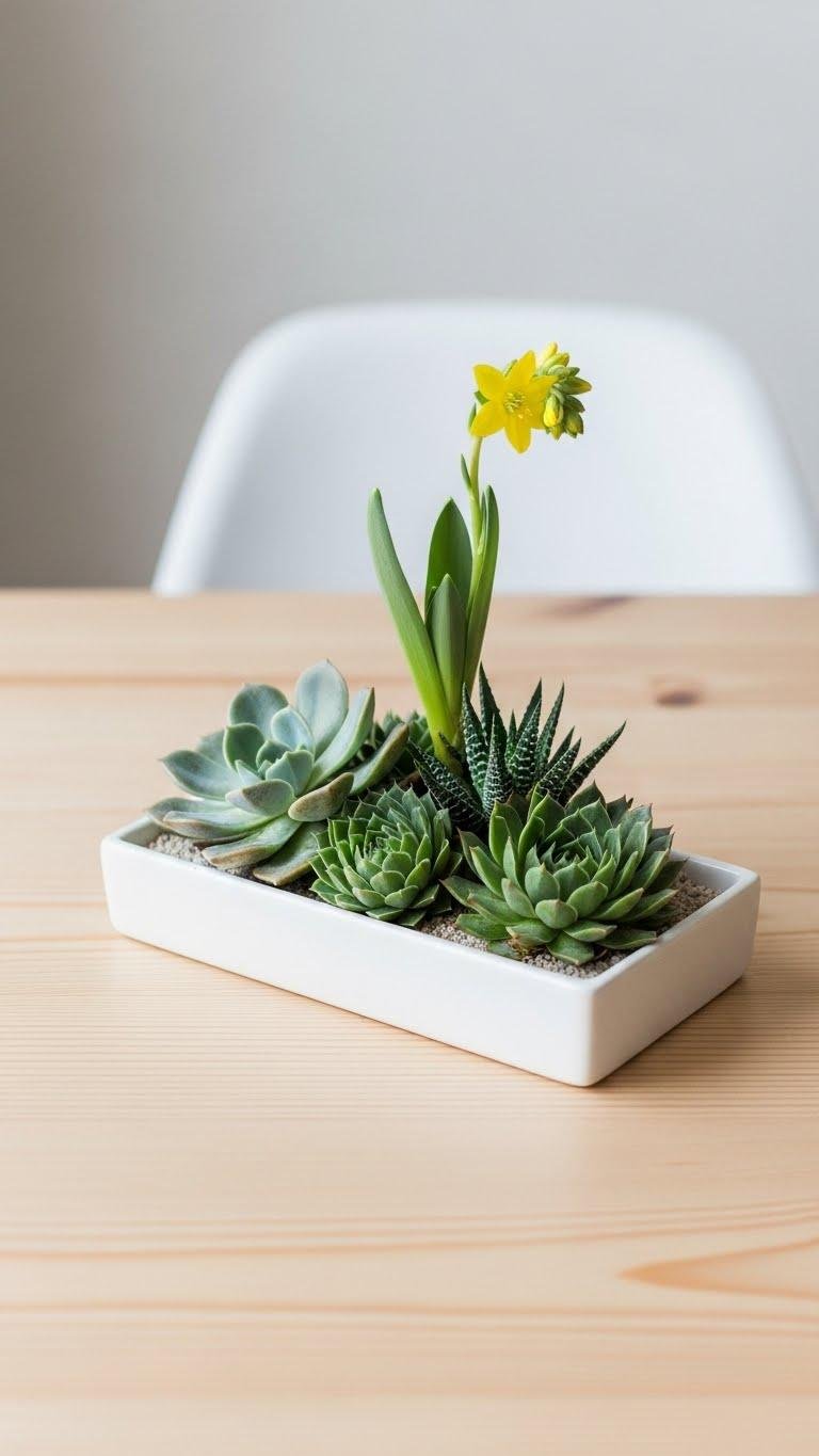 Keep a low succulent centerpiece on a tray, pair a single stem in a ceramic bud vase arrangement, and let texture and negative space do the work.