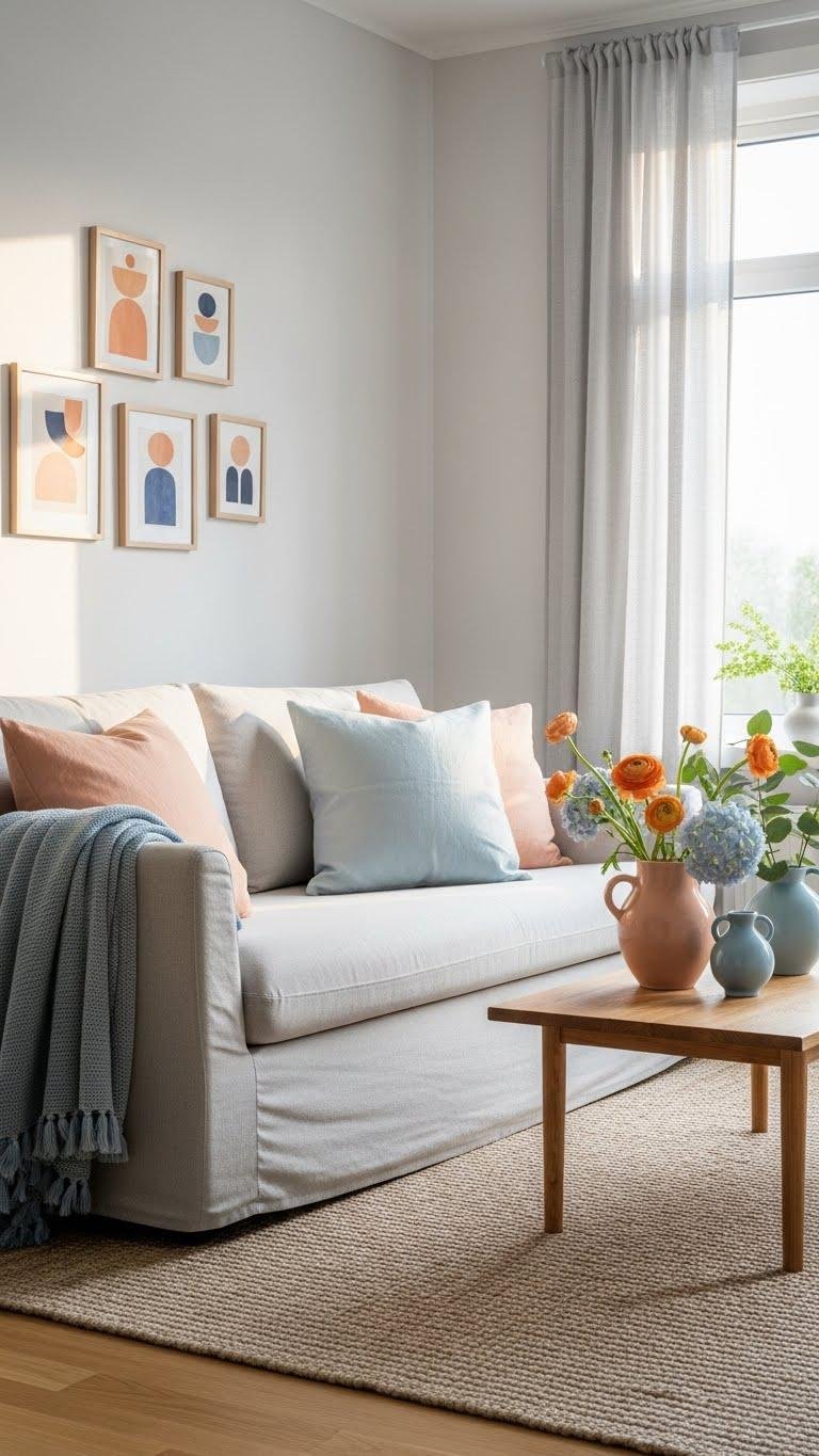 You’ll create a relaxed, artful vibe that feels open and easy—inviting you to lounge, read, or host without fuss while spring light pours in.