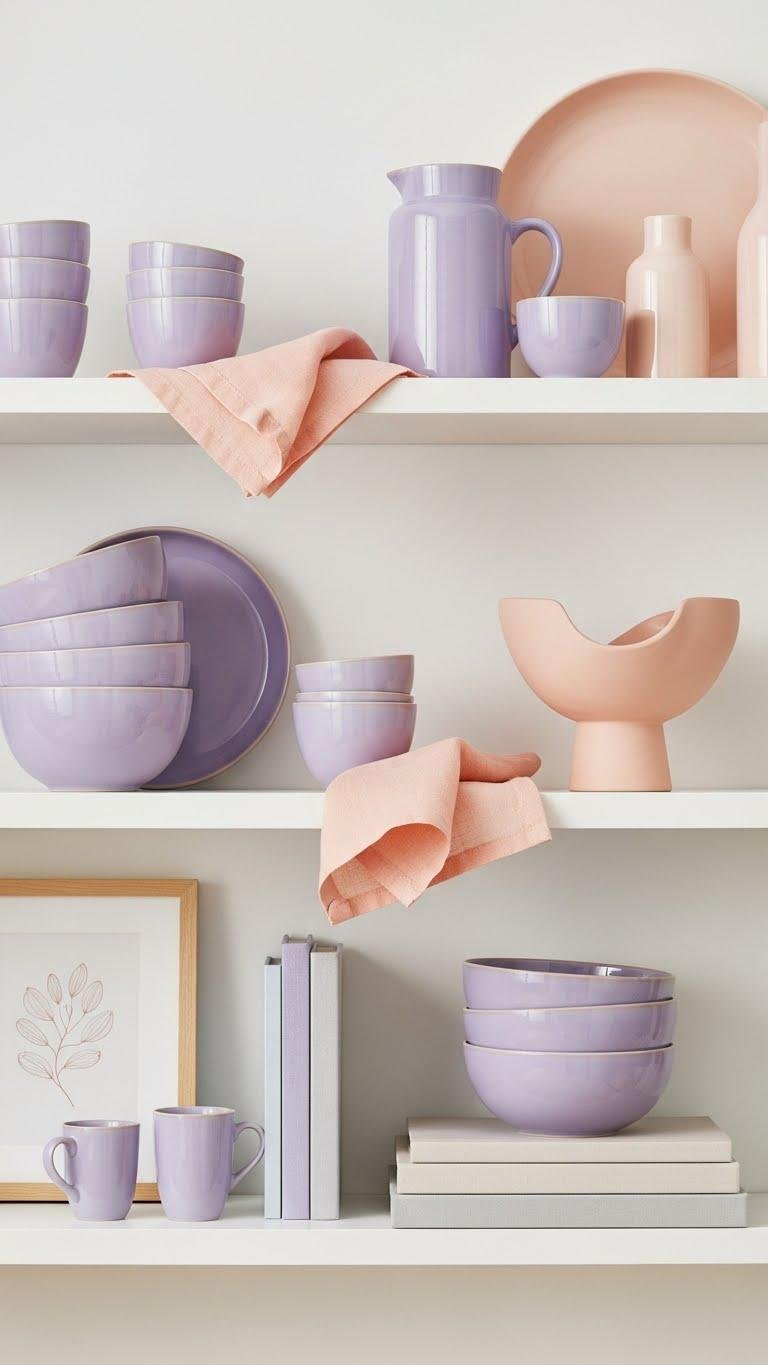 When you layer pale lavender and soft peach accessories on shelves, you create a quiet, cohesive color story that feels fresh without being fussy.