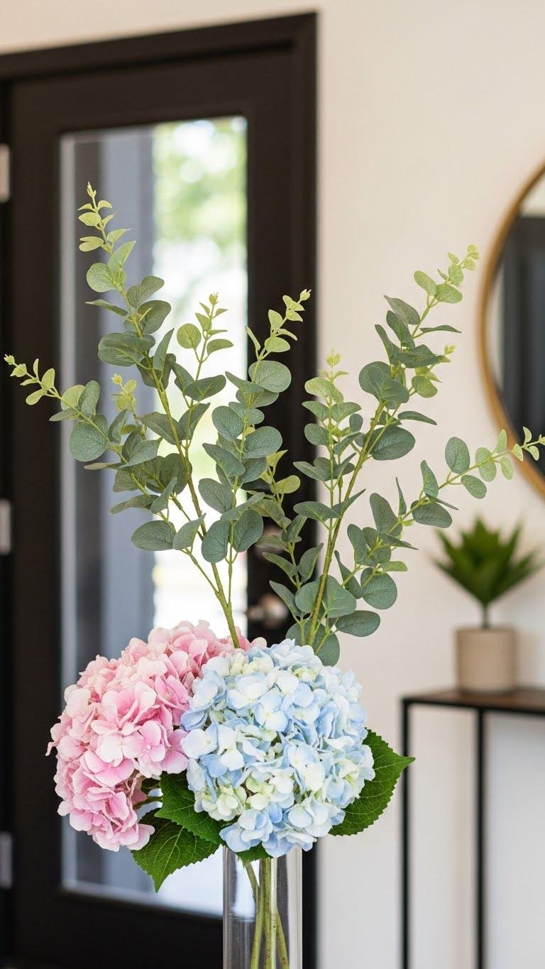 A few stems of eucalyptus paired with a cluster of hydrangea instantly lift a room—eucalyptus brings airy texture and subtle scent while hydrangeas add voluminous, soft color. You’ll mix dried eucalyptus with fresh or paper hydrangea in simple glass or metal vessels, trimming stems to vary heights. Place them by a doorway or on a slim console to welcome effortless, free-spirited style.