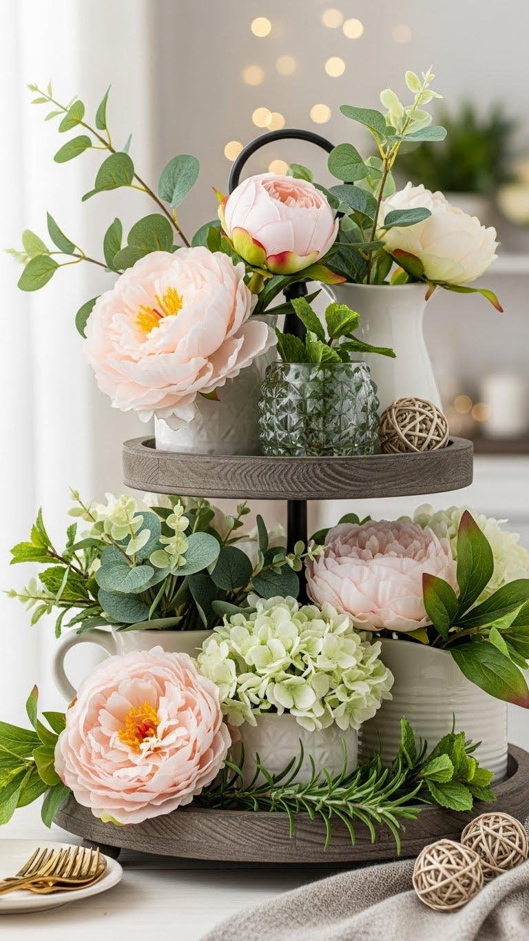 After you’ve placed eucalyptus and hydrangeas to greet guests, bring that same relaxed charm to a tiered tray by mixing faux and fresh blooms for lasting impact. You’ll balance a faux peony with a fresh sprig of mint or rosemary, use tiered styling for height and texture, and plan a simple seasonal switch so the tray feels effortless and resolutely yours.