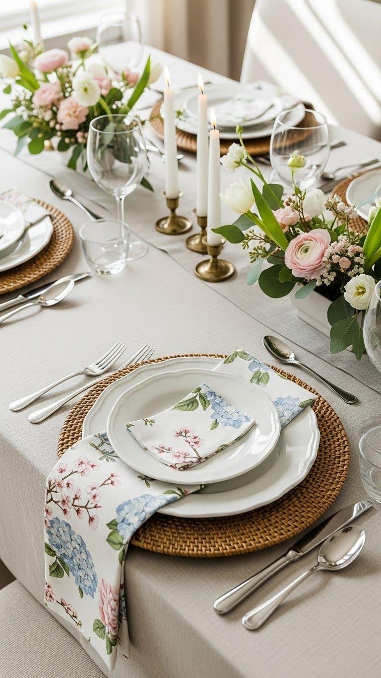 Bring fresh charm to your table by layering subtle floral napkins over neutral linens — they add pattern without shouting and make setting the scene feel intentional.