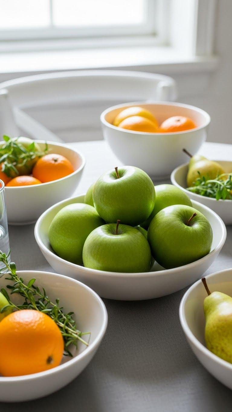 Lift a simple bowl of green apples onto your table to add crisp color and natural texture that feel instantly spring-ready. Place seasonal bowls of varying sizes near windows or entryways, mix whole fruit with sprigs of herbs, and rotate citrus or pears to keep it fresh.