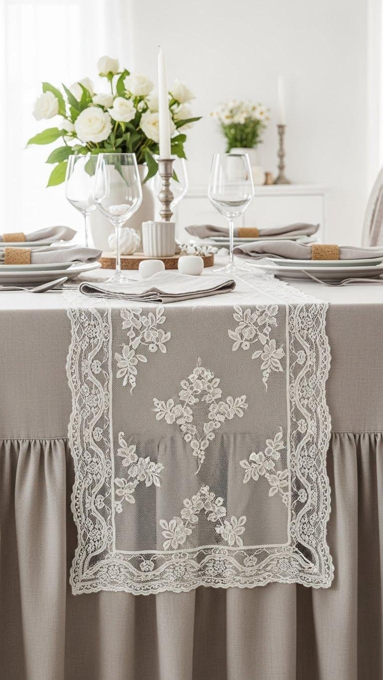 When you layer a delicate vintage lace runner over a soft ruffle tablecloth, you create instant depth and romantic texture without overwhelming the room. Embrace vintage layering and thoughtful lace pairing to mix history with modern ease.