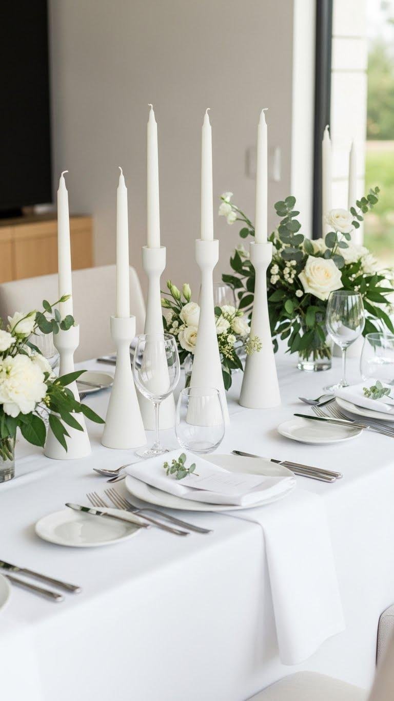 You’ll choose matte ceramic or porcelain silhouettes to emphasize tapered simplicity and modern calm. White candlesticks create negative space, highlight florals and linens, and let you mix heights confidently—freeing your scheme to feel airy, intentional, and effortlessly elegant.