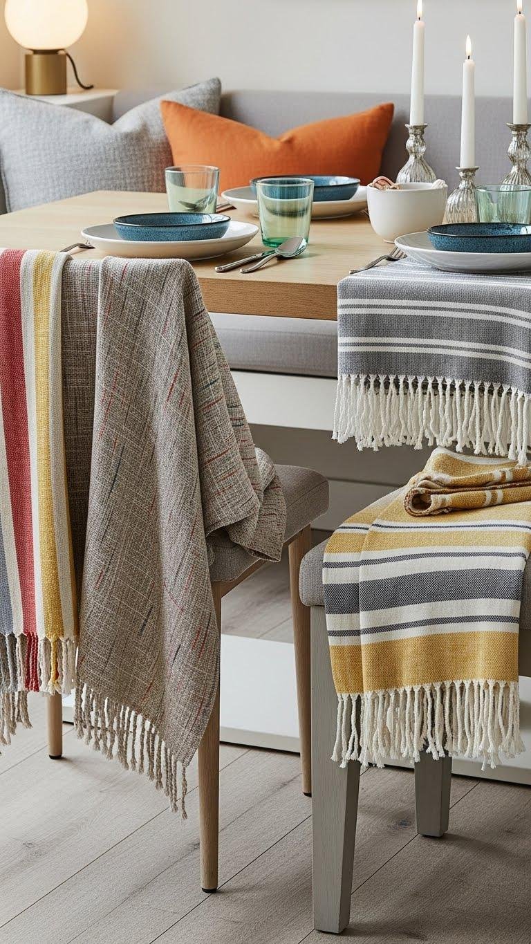 As temperatures soften, layer thin throw blankets in breathable fabrics like linen, cotton and lightweight wool to add color, texture and cozy versatility to your dining nook.