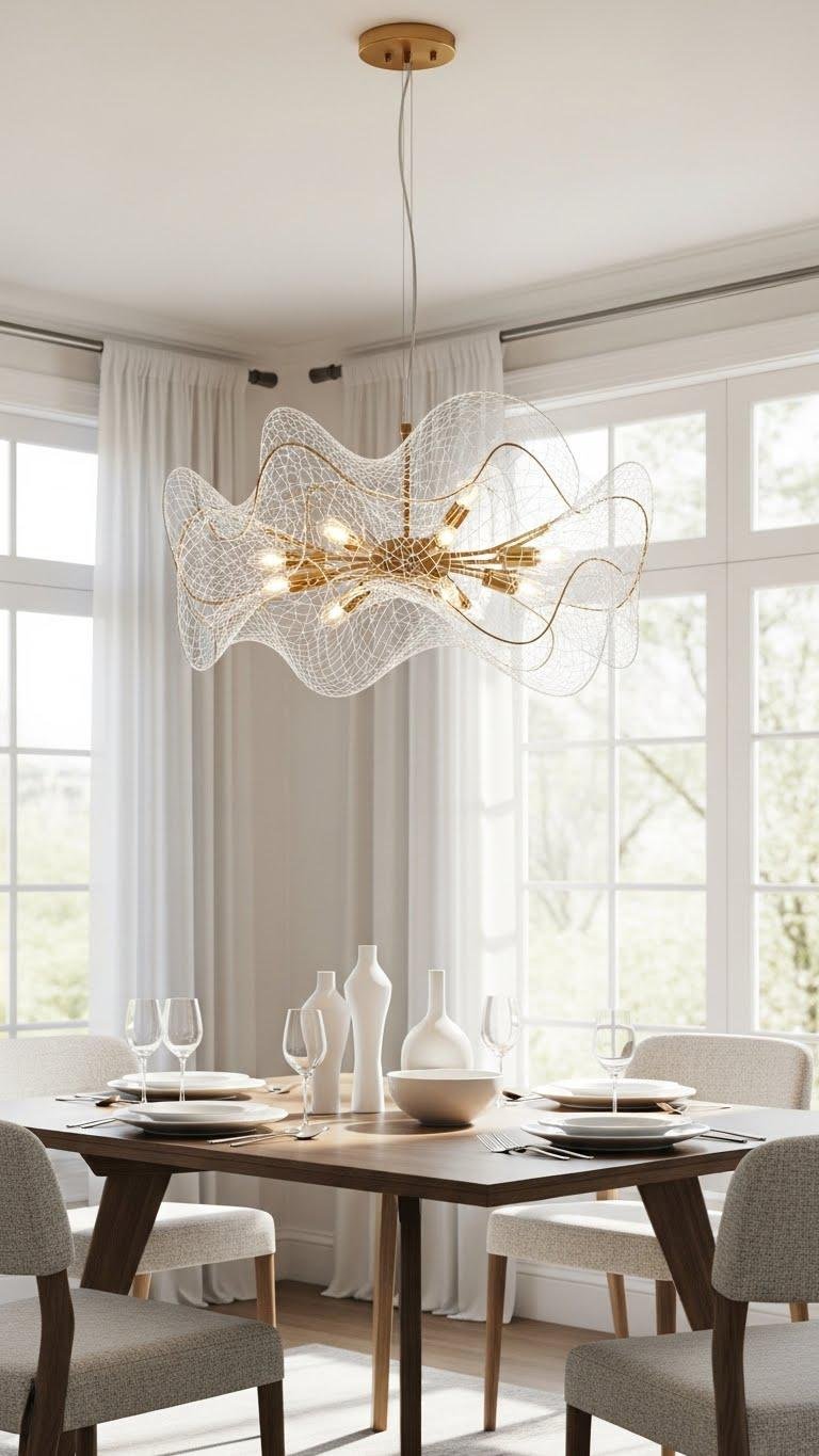 Hang a sculptural statement chandelier to anchor your dining space and instantly elevate the room’s spring refresh. Choose sculptural lighting that balances scale and openness so you keep sightlines and a liberated feel. Think about chandelier placement over the table, height, and proportional width; center it to define the zone and let the piece act as artful focal point without overwhelming your airy seasonal palette.