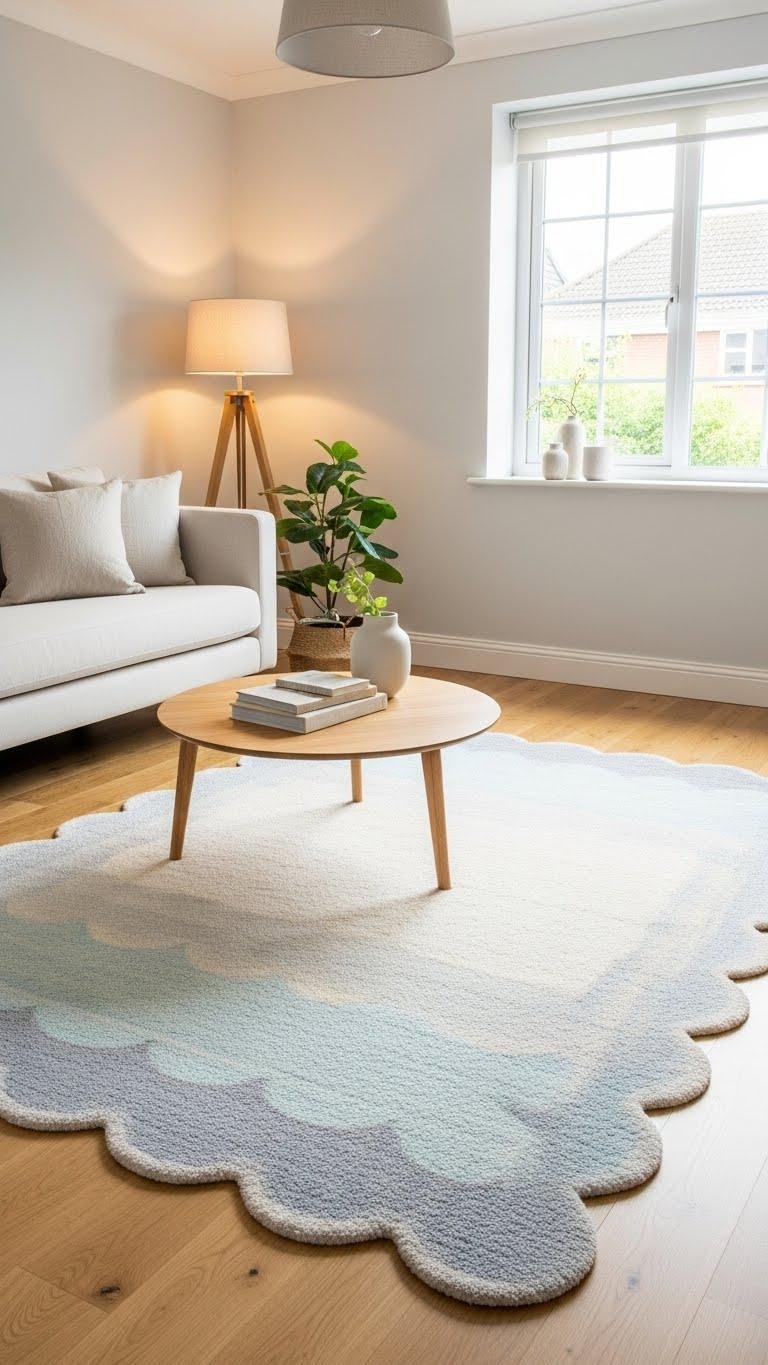 Often a subtle change, swapping a straight-edged rug for a scalloped one instantly softens hard floors and lifts the room’s mood. Choose a lightweight scalloped texture in airy hues to define dining zones without feeling heavy.