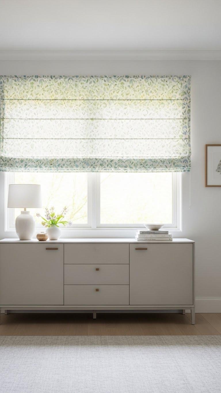 Now that your sideboard sets a soft, airy tone, rethink window treatments to keep the room light and layered: swap heavy curtains for patterned Roman shades. Choose subtle motifs and breathable fabrics so patterned shades bring personality without overpowering. You’ll gain roomy light filtering that maintains privacy while feeling liberated and modern—clean lines, easy operation, and a refined, spring-ready vibe that frees the space.