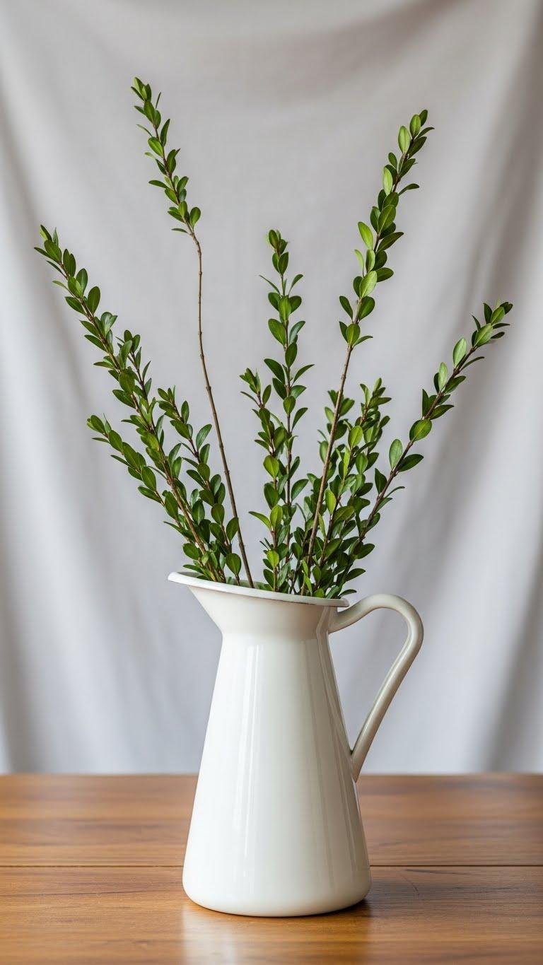 A crisp white pitcher provides the perfect minimalist vessel for dried boxwood stems, and you’ll find its clean silhouette highlights the textured greenery without competing with your table’s other elements.