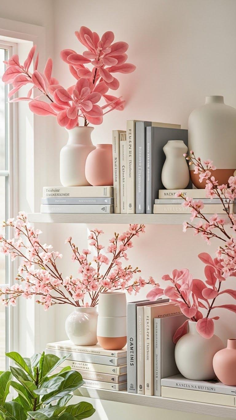 Pairing eucalyptus’s muted palette with pops of pink gives your dining room a fresh, modern edge — and shelves are the perfect place to show it off. Arrange faux pink succulents and delicate blush sprigs among books and ceramics to create layered, carefree vignettes. Opt for varied heights and matte textures so each shelf feels intentional, airy, and effortlessly free-spirited.