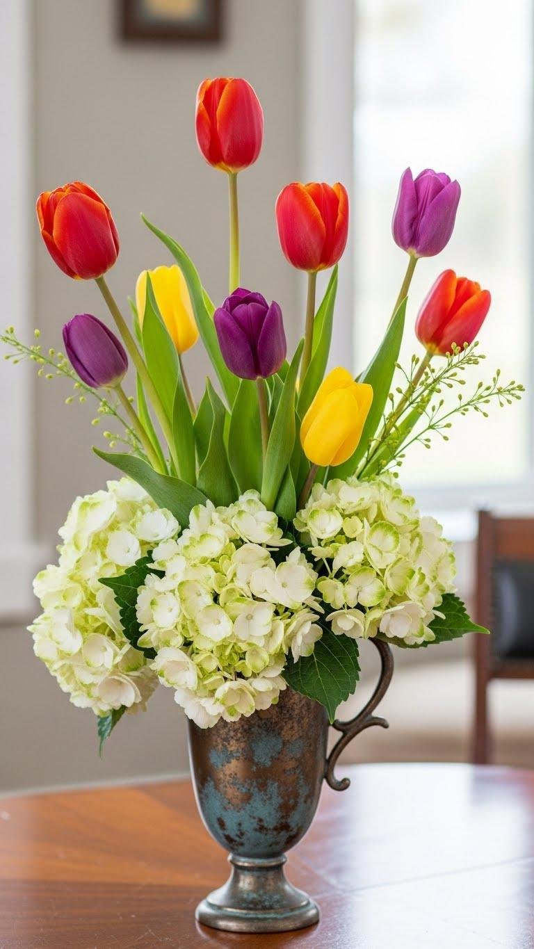 Bring a tulip garden centerpiece to life by letting upright tulips form the structured heart while creamy hydrangea spills soften the edges and add lush volume. You’ll create a striking garden silhouette by arranging varied heights, trimming stems for balance, and tucking hydrangea around the base.