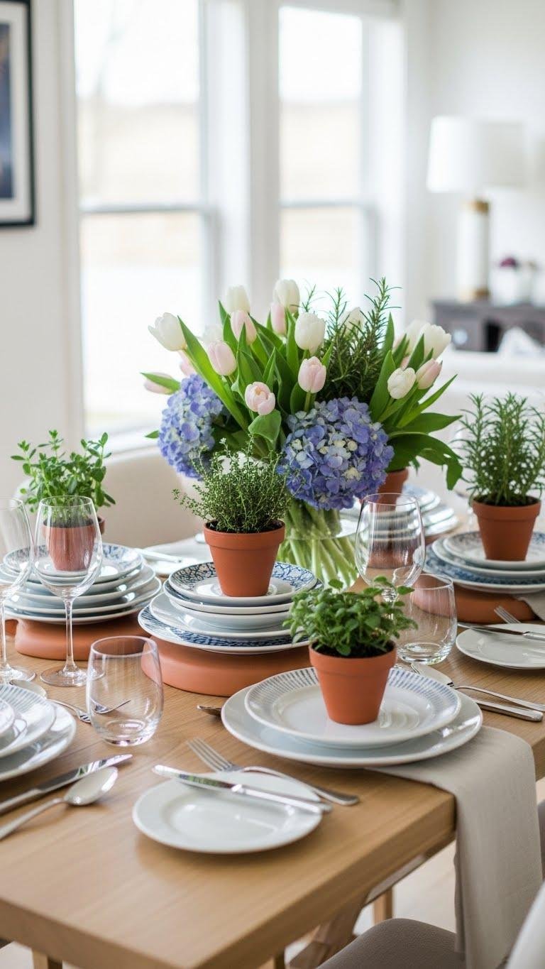 After your tulip-and-hydrangea centerpiece commands the table, introduce height and visual interest with simple plates used as risers for small potted plants.