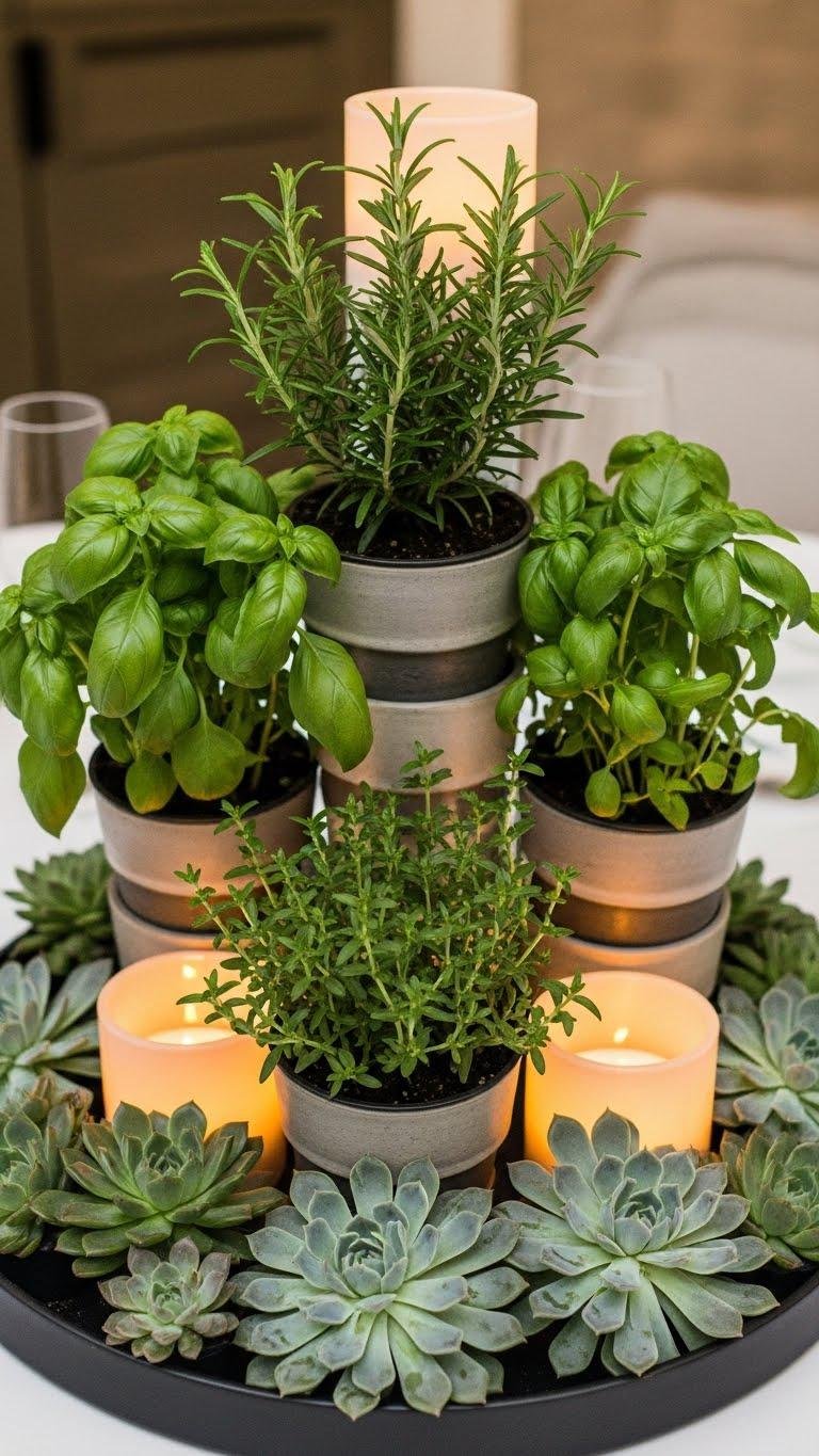 Pull together a vertical tray display to add height and layered interest to your table while keeping everything tidy. You’ll create an herb laden, candlelit focal point by stacking a vertical arrangement of small pots and botanical candles. Position taller herbs at the back, low succulents forward, and stagger candle heights for depth. You’ll enjoy effortless elegance that feels liberated and intentional.