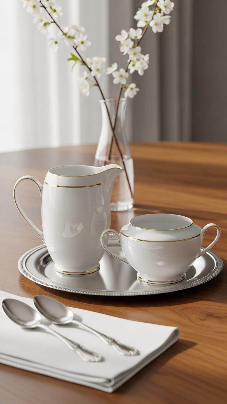 For a polished yet approachable table vignette, group a creamer and sugar bowl on a small platter so they read as a single, intentional element; you’ll anchor the duo with the platter’s shape and finish while letting each piece’s texture and scale do the talking. Choose a porcelain pairing, vary heights subtly, add vintage spoons, and keep surrounding pieces minimal so the set breathes.
