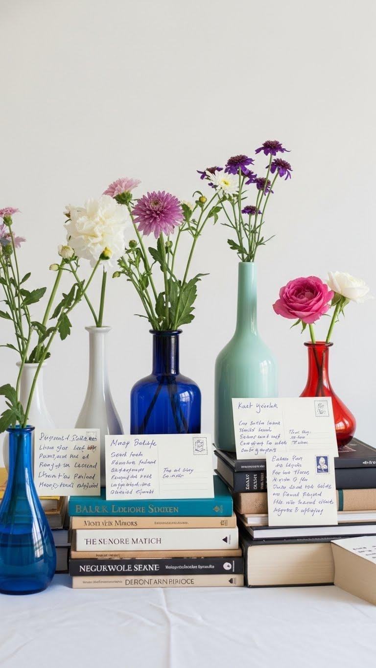 You’ll layer eclectic vases of varying heights with stacked books, tucking in handwritten notes or a postcard for intimacy.