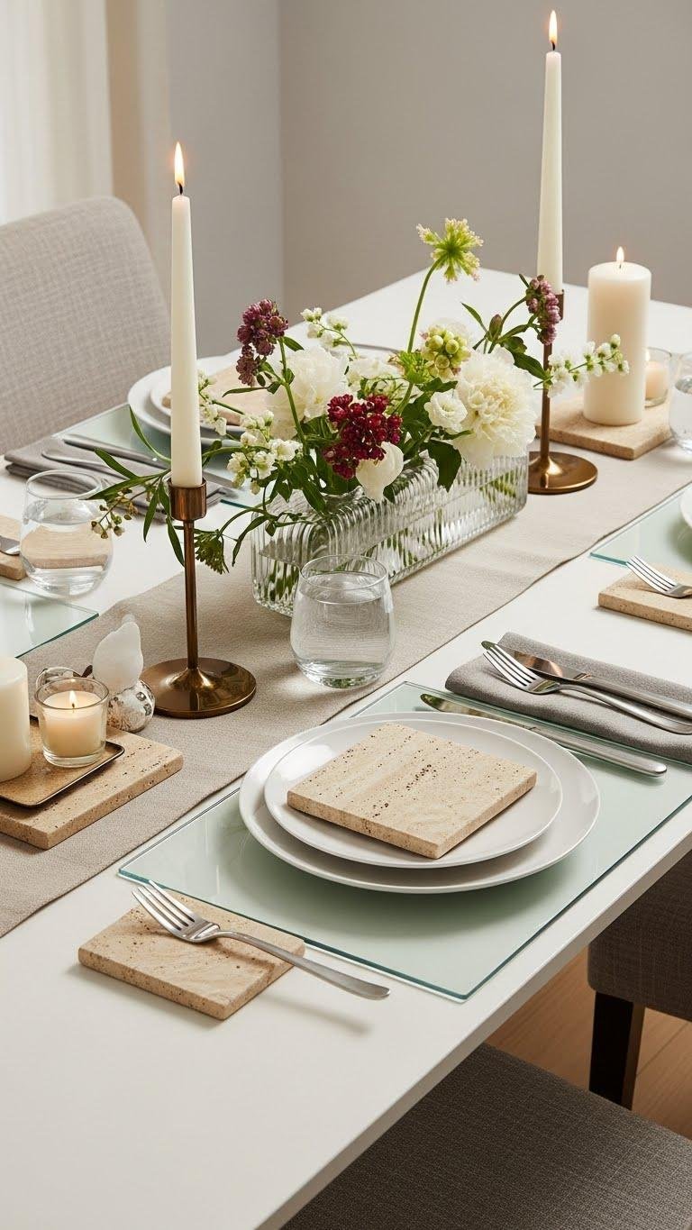 By pairing the warm, textural weight of travertine with the lightness of glass, you get a centerpiece that feels both grounded and unexpectedly modern. You’ll mix travertine coasters and slim glass placemats to balance earth and air, placing candles or a low vase for visual calm.