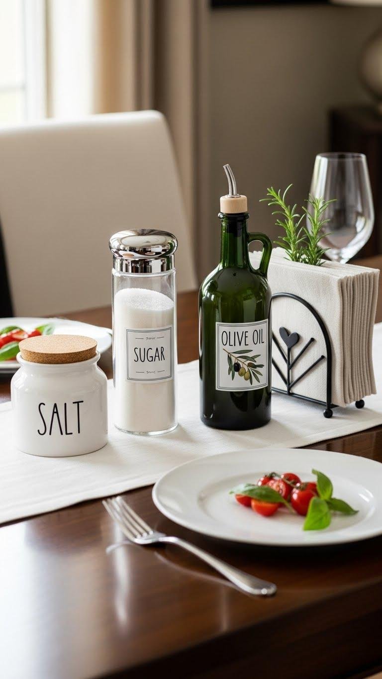If you want a dining table that’s both beautiful and useful, arrange a small collection of canisters that serve real purposes—salt, sugar, olive oil, napkin holders—so each piece earns its place while contributing to an intentional look.