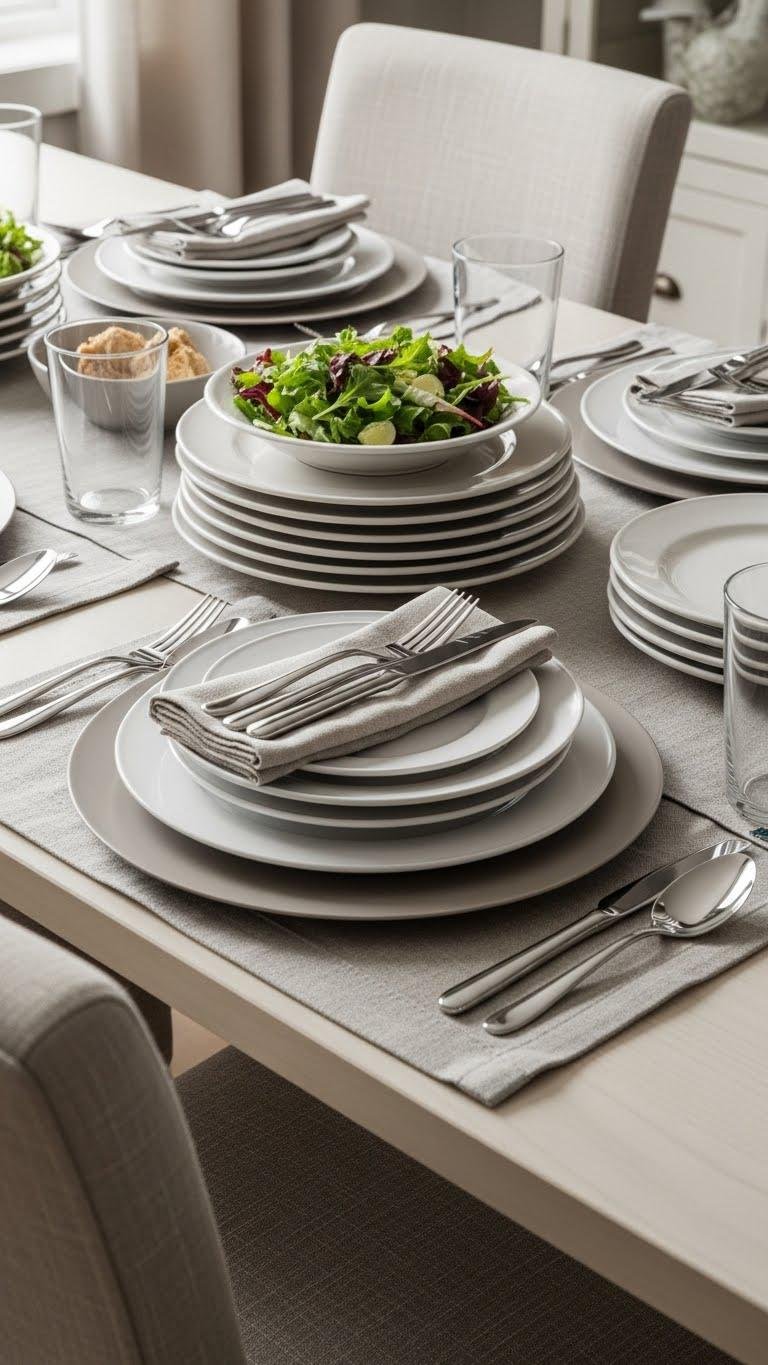 Start with a neat stack: layered chargers, dinner plates, and salad plates create instant structure and visual rhythm across your table.