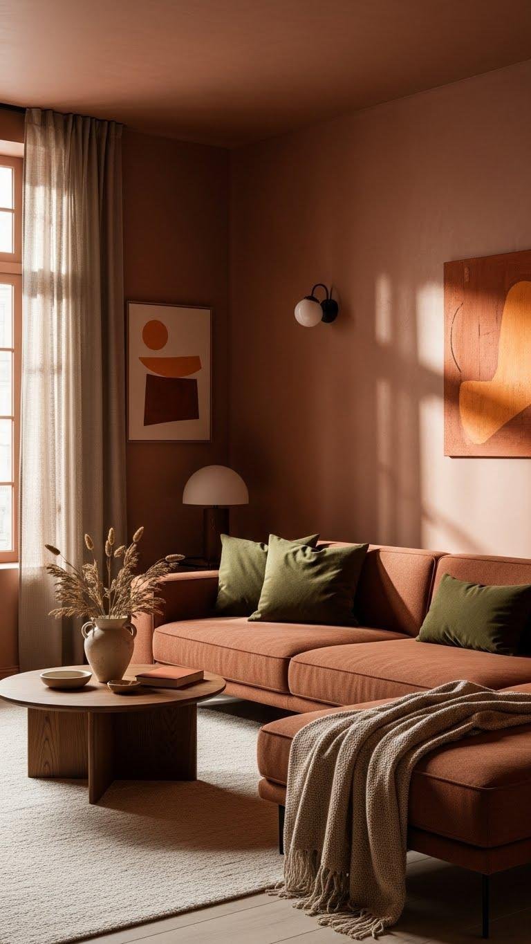 Pairing olive and terracotta brings a grounded, modern warmth to a room that feels curated rather than contrived.