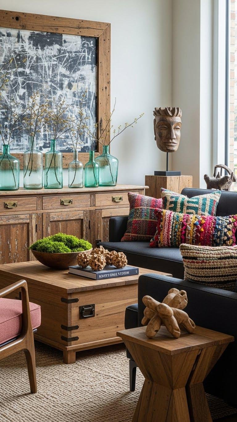 If your battered credenza and sleek sofa tell a story, let upcycled and sustainably sourced pieces finish the narrative—bringing thoughtful reuse into the aesthetic so your apartment looks curated, not curated-for-Instagram. You’ll mix upcycled textile cushions, reclaimed glass vases, and furniture with vintage hardware, choosing sustainably harvested wood and bold, individual pieces that prove responsible style feels freeing, not restrictive.