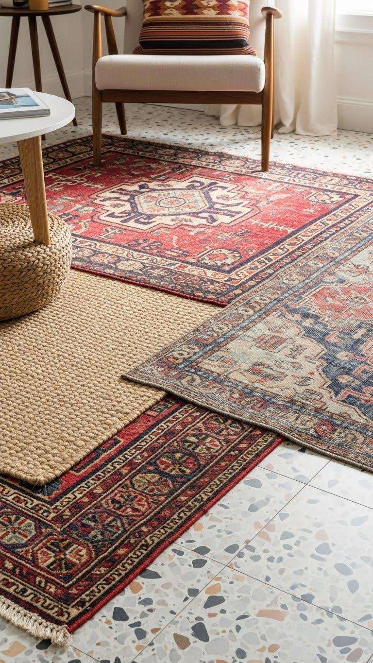 Mix layered sisal with a bold kilim or faded vintage for contrast; pair with textured terrazzo tiles to ground the space.