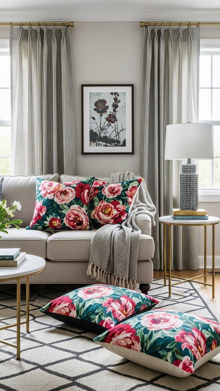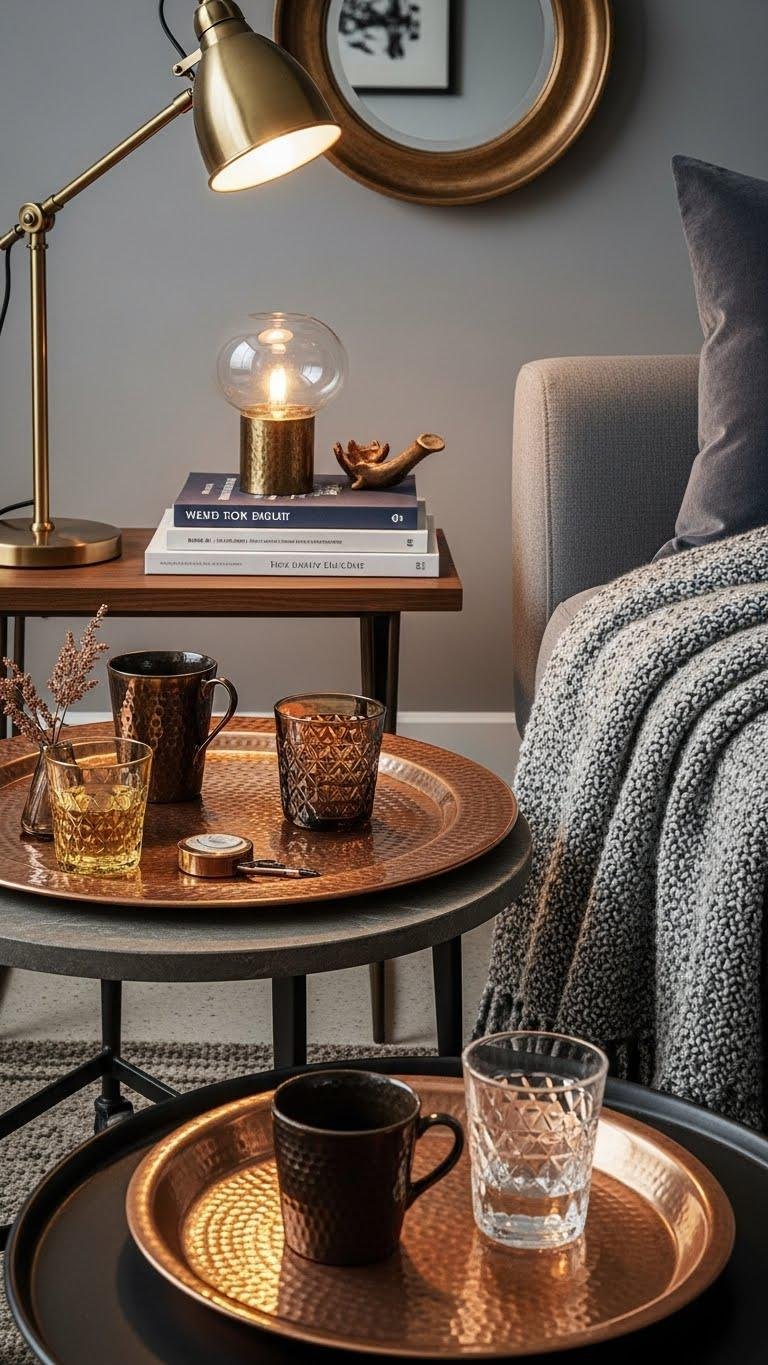 You’ll want to mix warm metallics and tactile finishes to give a room instant depth and personality—think brushed brass lamps, hammered copper trays, and a velvety boucle throw that invites touch.