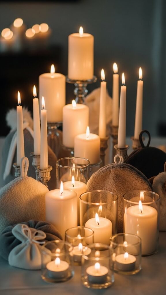 You’ll mix heights with pillar candles, taper holders and glass votives, tuck tea cozies nearby for soft texture, and leave negative space so the glow breathes. Keep colors muted, scents subtle, and placement flexible so evenings feel unconfined and inviting.