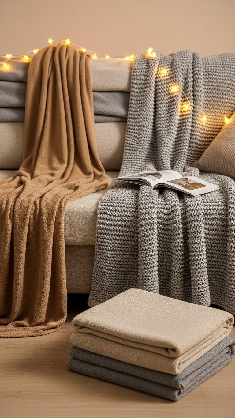 After the glow of string lights sets the mood, layer throw blankets on sofas and beds to add tactile warmth and visual interest. You’ll mix Neutral neutrals—think sand, oatmeal, soft gray—with a bold Knit contrast for depth.