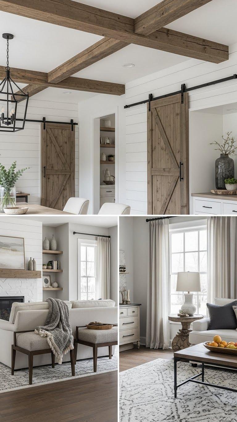 You’ll embrace open space, neutral tones, and tactile layers—wool throws, linen sheers, a statement rug—plus barn door cabinetry for practical charm that lets you live free, uncluttered, intentional.