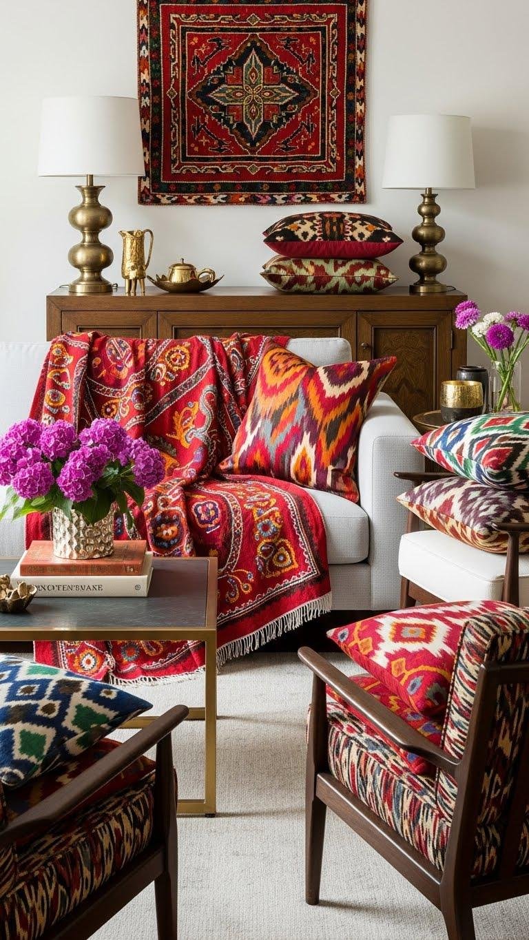 Kick-start your winter scheme with bold, unexpected color and global textiles that layer personality without chaos. You’ll mix vibrant suzani throws and layered ikat cushions to create fearless focal points, pairing them with streamlined furniture and warm metallics. Let each piece feel collected, not cluttered, so your space breathes—free, stylish, and unmistakably yours this season.