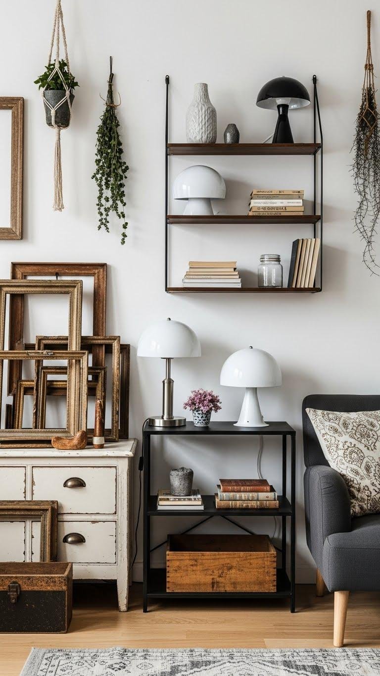 After warming your walls with botanical hangings, bring that same layered look down to eye level by mixing thrifted treasures with sleek modern pieces. You’ll pair worn frames and vintage hardware with minimalist shelves, then add curated lamps for mood.