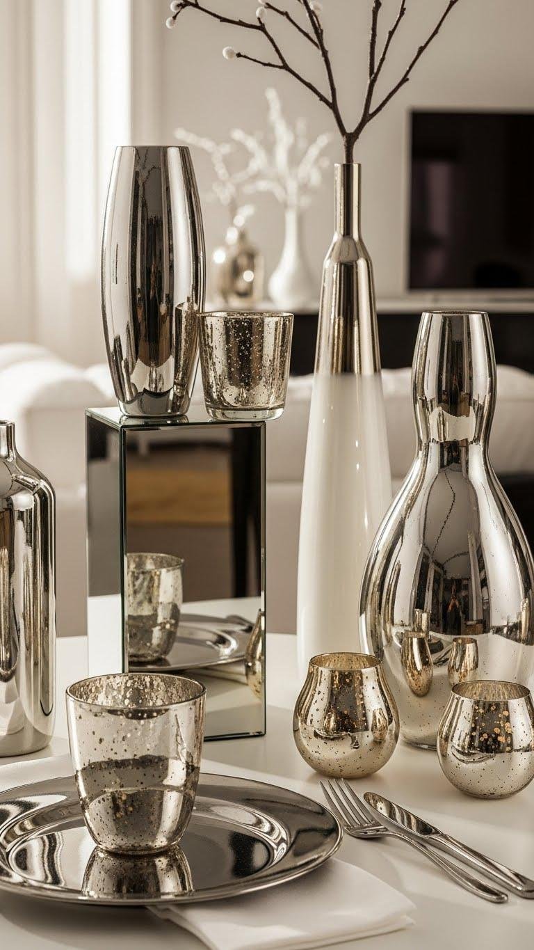 Catch winter light by layering silver and metallic accents that reflect the season’s low, angled sun and add instant polish to your apartment. You’ll mix reflective centerpieces and sleek mercury vases with matte textures to keep things grounded.