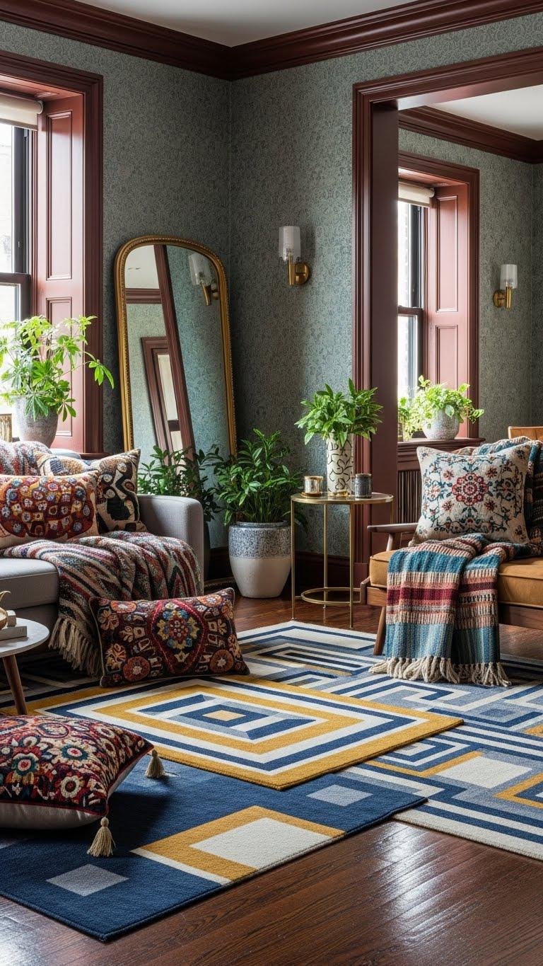 Layer textures sparingly so the rug remains the room’s unapologetic centerpiece.
