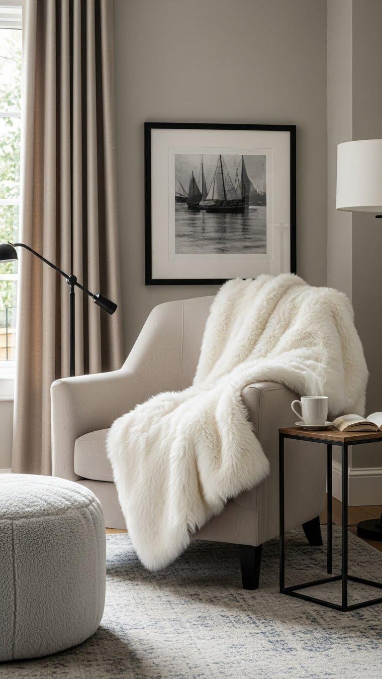 You’ll mix neutrals with a bold accent, pair with faux shearling ottomans or a slim side table, and choose luxury imitative throws that feel indulgent yet effortless, freeing your space without fuss.