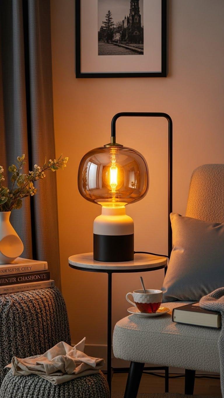You’ll find that a warm-toned table lamp instantly turns a cold corner into a cozy nook, casting amber light that flatters textiles and skin alike. Choose tactile ceramics or amber glass bases to add weight and sensuality; pair with matte brass or black accents. You’ll create a liberated, intimate retreat for reading, sipping tea, or simply pausing — minimal, intentional, and utterly inviting.