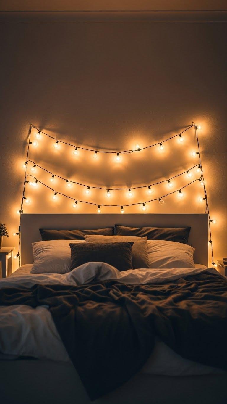 Regularly draping fairy lights over your headboard instantly transforms a plain bed into a soft-focus centerpiece, bathing the room in a warm, twinkling glow that reads both modern and romantic.