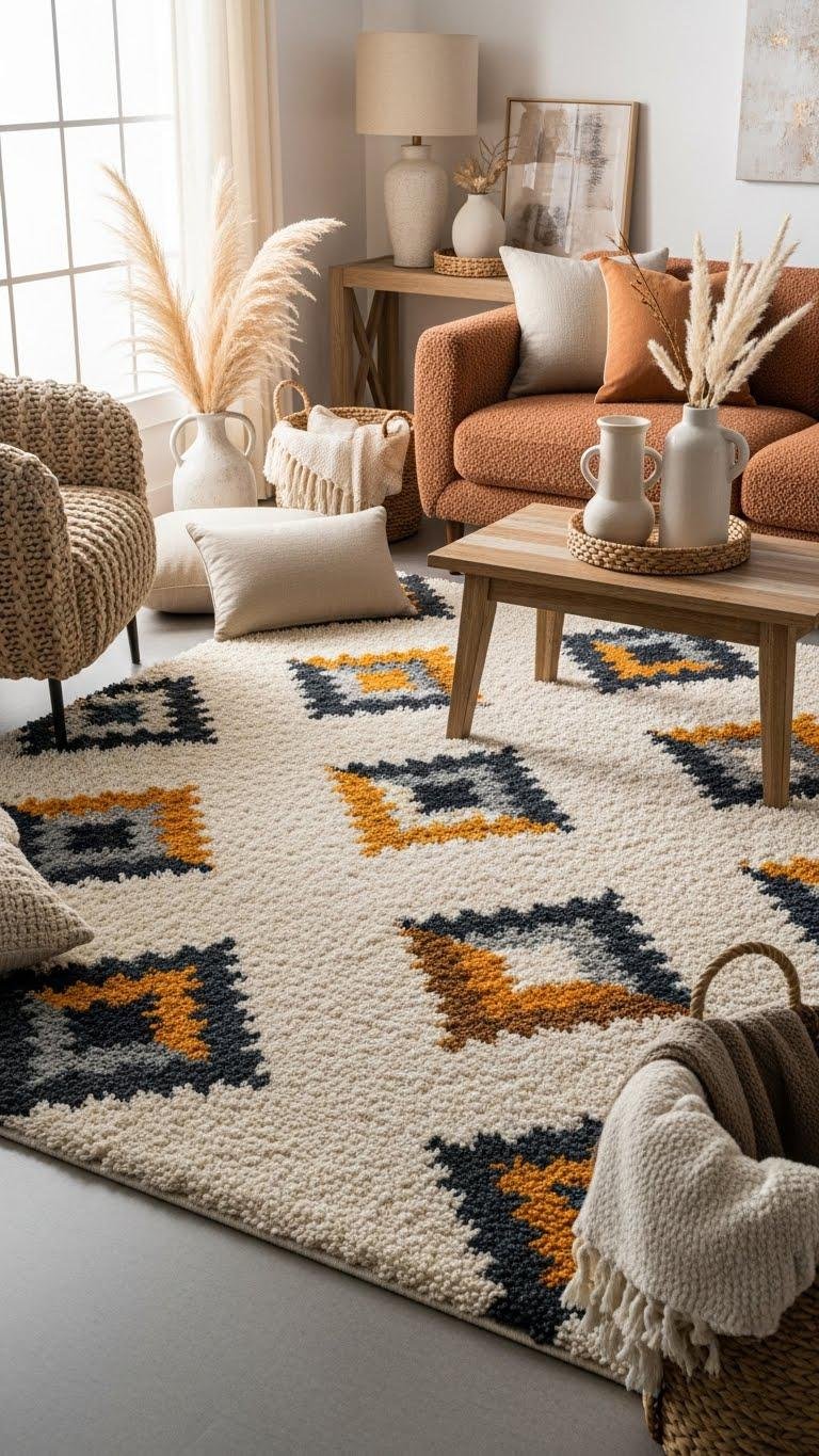 Anchor the room with a plush, high-pile rug that immediately grounds your layout and adds tactile warmth underfoot.