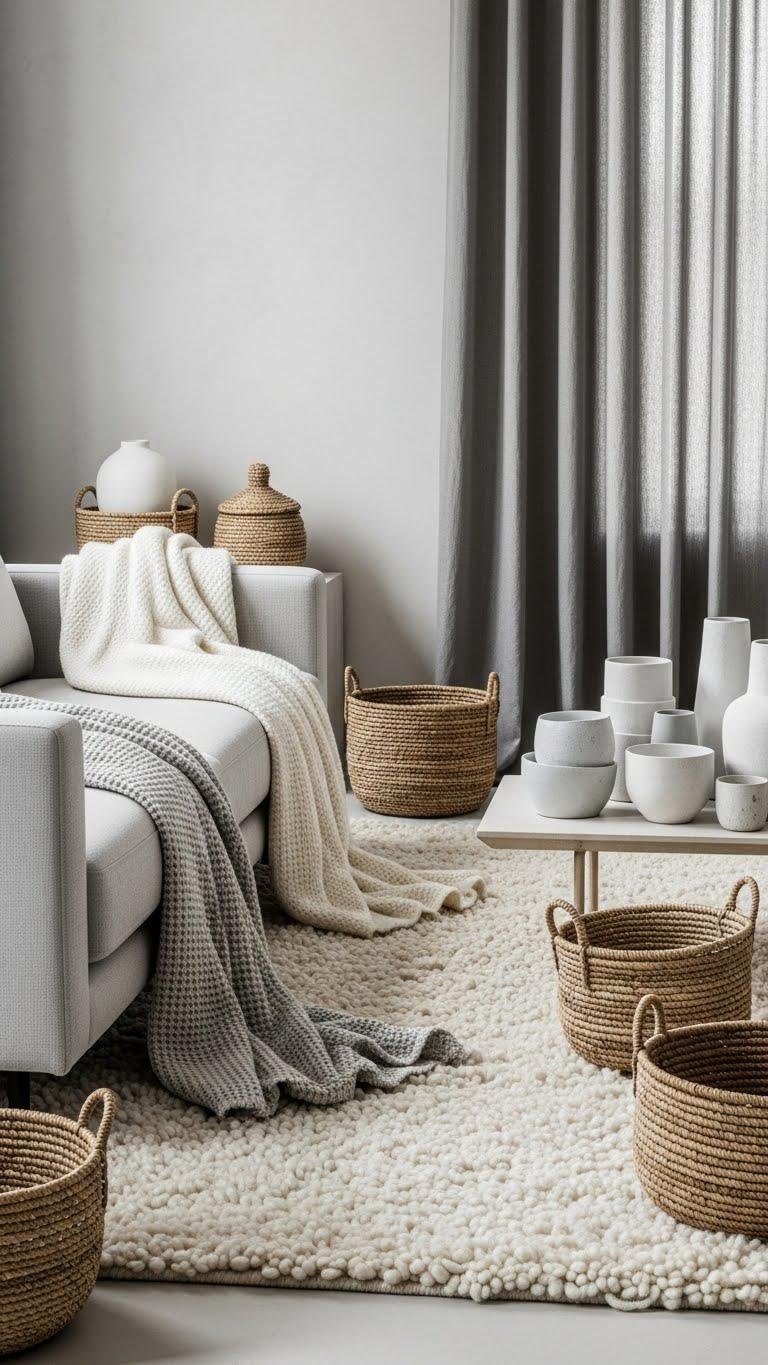 Embrace soft neutrals across walls, linen, and ceramics, then add interest with layered textures—wool throws, matte plaster, and woven baskets.