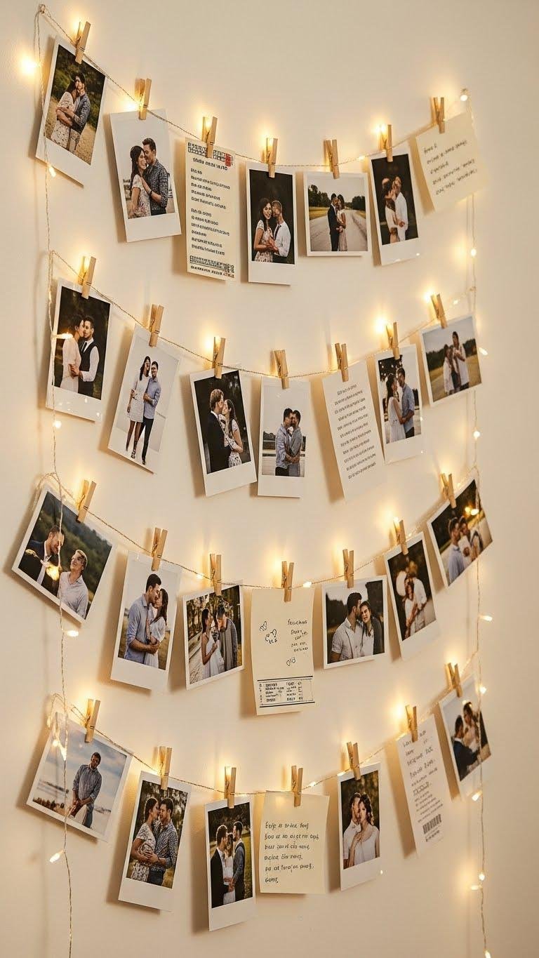 Create a polaroid timeline with twinkle clips, spacing shots chronologically. You’ll mix candid prints, ticket stubs, and tiny notes for texture. Keep cords neat, vary heights, and let this liberated display feel personal, modern, and effortlessly romantic.