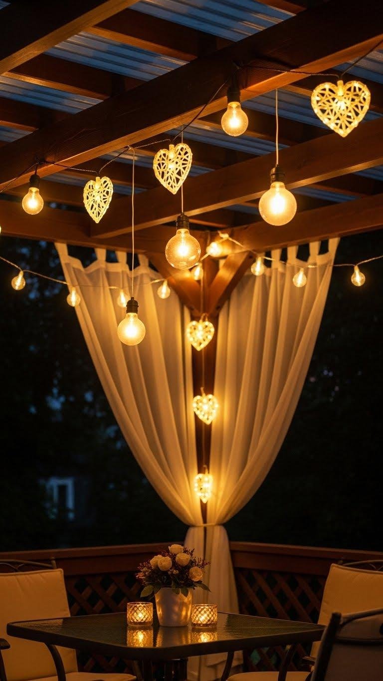 After you’ve warmed an indoor wall with clipped photos and fairy lights, take that same intimate glow outside by stringing heart-shaped lights across your patio. You’ll pick weatherproof bulbs, weave them through pergola beams, and layer sheer patio drapes for soft silhouettes. Arrange varying sizes and warm hues, hang at different heights, and let the lights sculpt a liberated, cozy outdoor nook for lingering conversations.